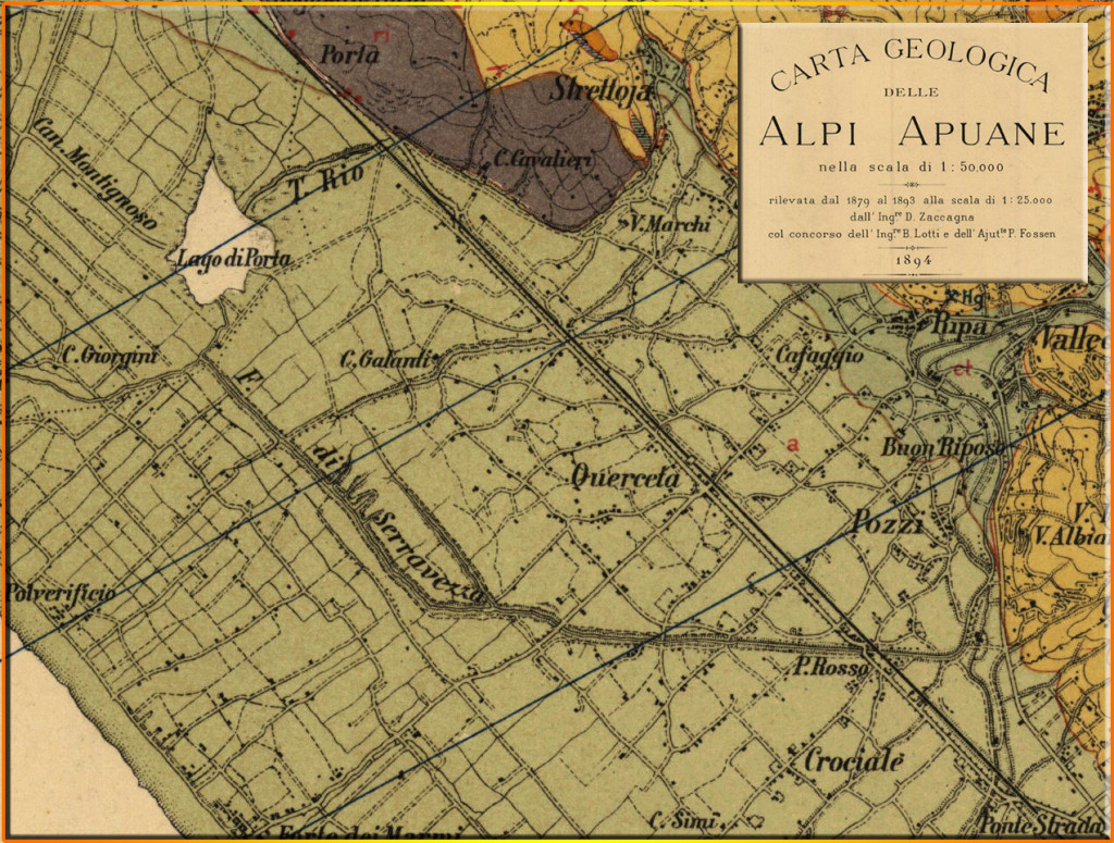 Una Cartografia del 1879 che riporta il tracciato della Ferrovia e la Stazione di Querceta.